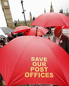 A Mexican wave of protest is travelling around the country in response to the Post Offices plans to close 2,500 local branches. They are rolling this programme out, area by area in order that there is not a synchronised national movement against them. Each time closures are announced, a six week period is given for “consultation”. So far only a tiny minority of branches have been reprieved. This is on top of the ongoing closures of Crown Post Offices, with their functions being taken over by WHSmiths.